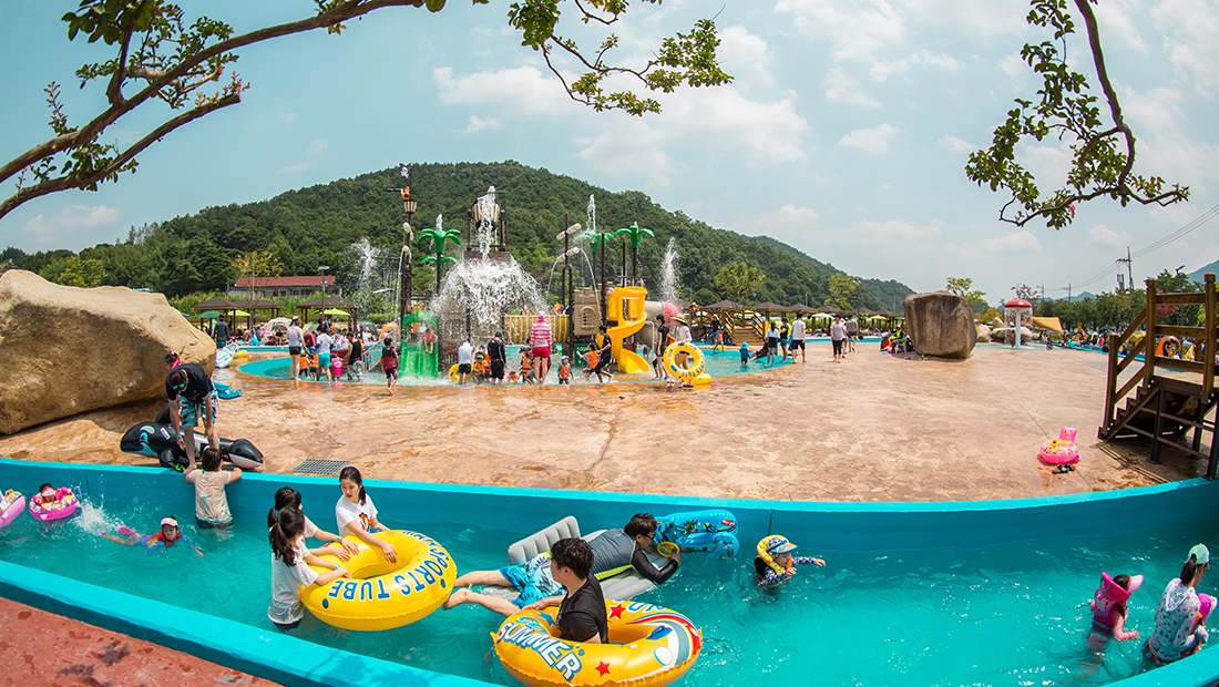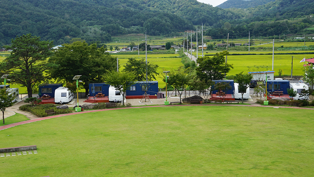푸른 들판 위에 숙박시설, 체험시설, 물놀이장, 카라반 등을 이용할 수 있다.